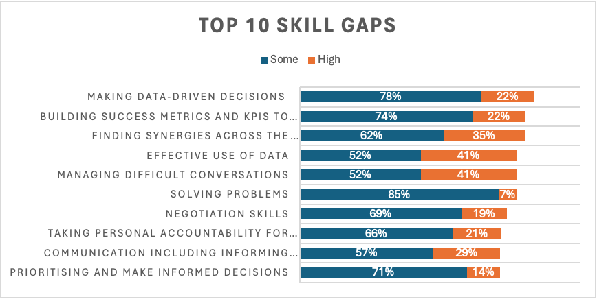 With regard to specific skills there were some patterns. Utlising data is was the most notable problem area with 100% of respondents stating they had “Some” or “High” skills gaps in Making Data-Driven Decisions and 93% reporting gaps in Effective Use of Data. This is also reflected by gaps in Building Success Metrics and KPIs to Determine Process & Success of Business (96%). The introduction of technology has increased the availability of data for monitoring and decision making, making skills gaps more apparent.